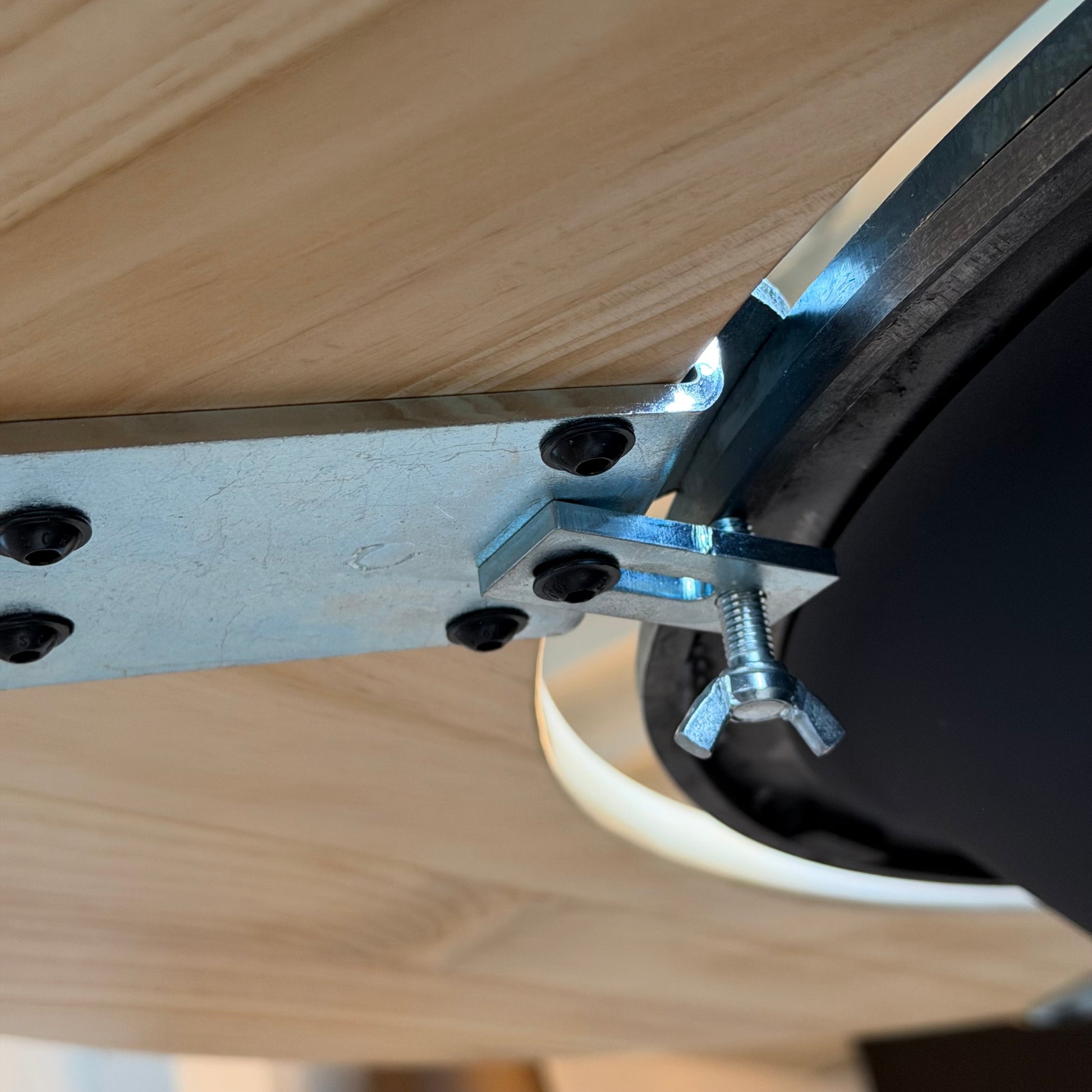 Hij hangt op de bovenkant van de bakplaat met een slim klemsysteem zet u hem met 4 vleugelmoeren snel vast en los. Hij is er daarna ook eenvoudig af te halen.