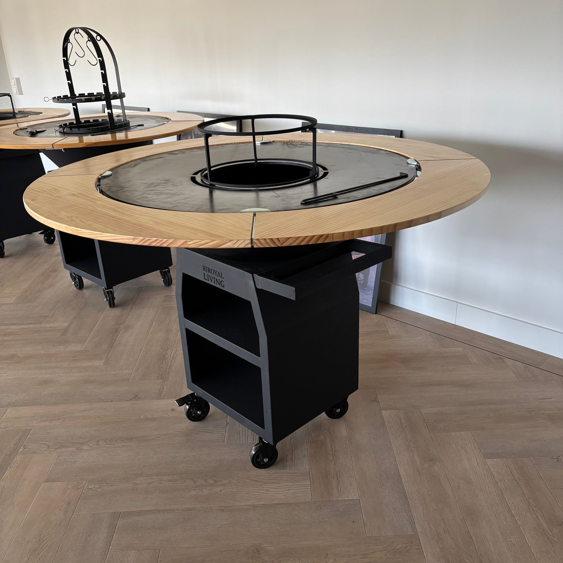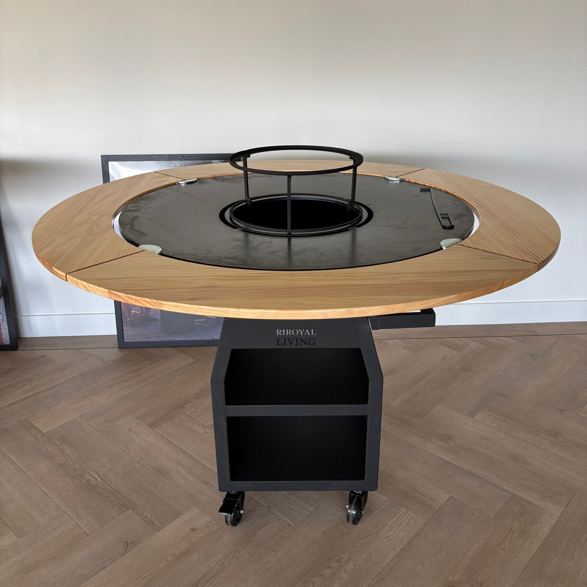 De BBQ Plancha Grill Maestro XXXL 100cm Blackline met houten omranding (Mesa) heeft een 100cmØ bakplaat die 8 mm dik is en is met de houten omranding (Mesa) totaal 143 cm Ø en een feestje voor 50 man probleemloos aankan door zijn enorm bakoppervlakte.