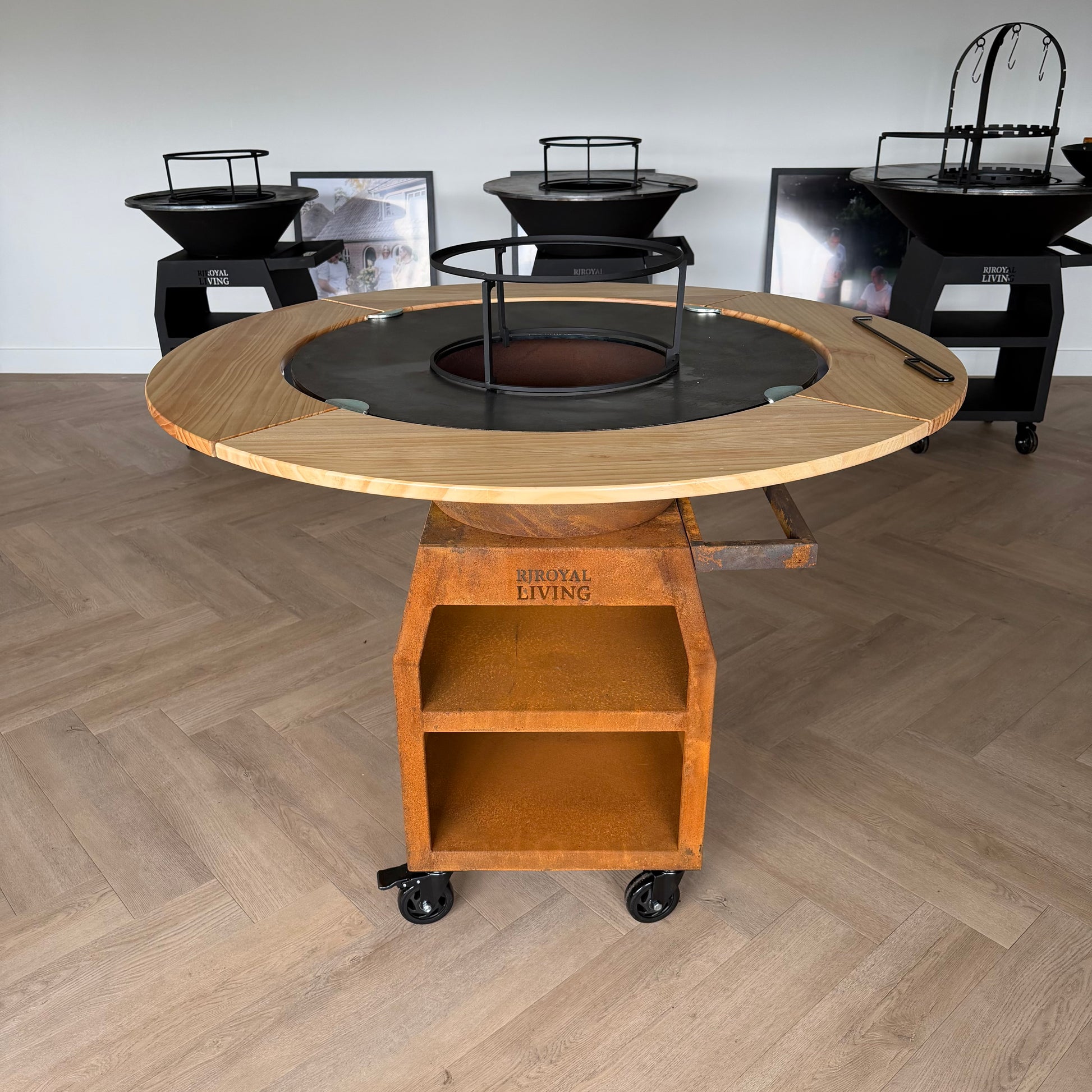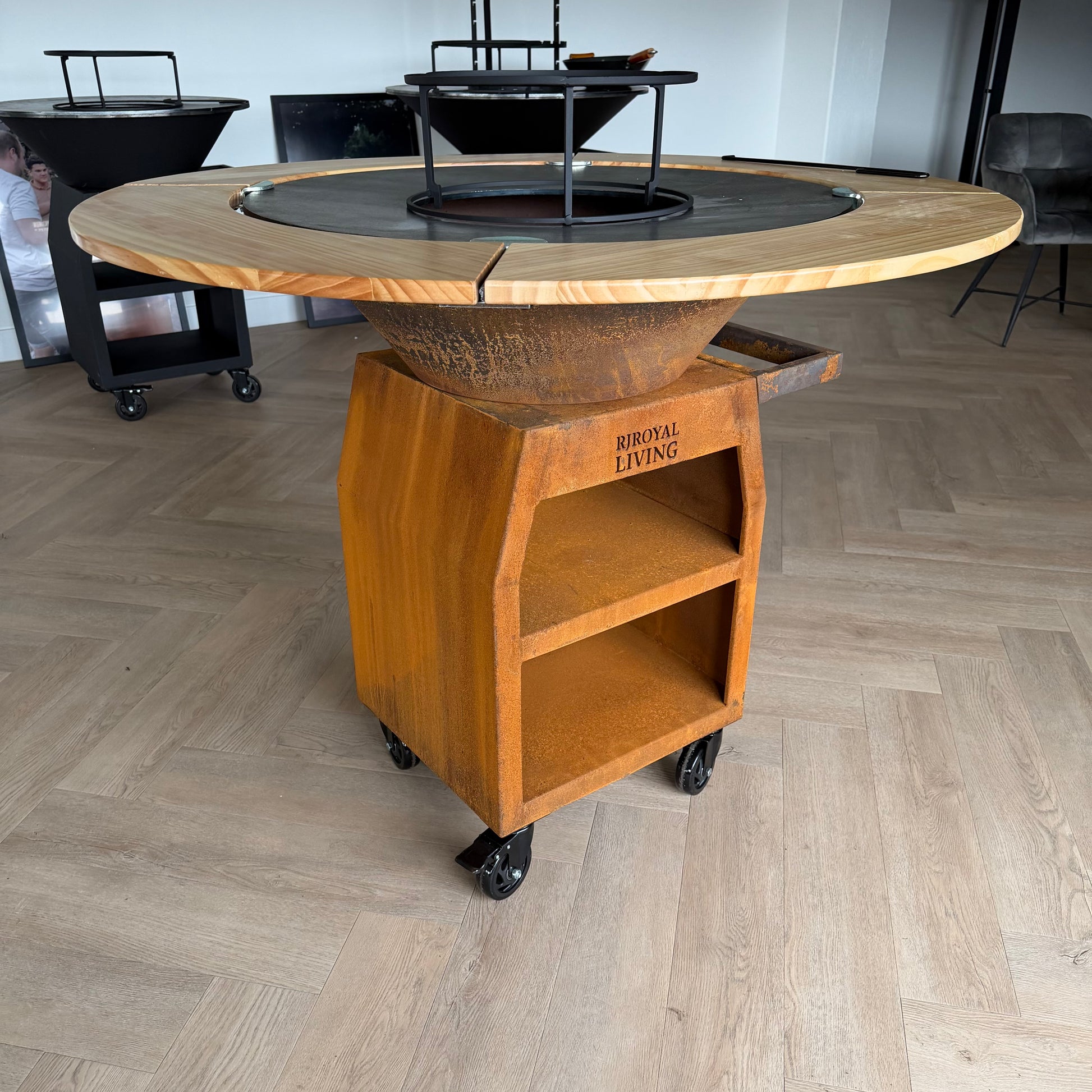 De BBQ Plancha Grill Maestro XXL 80cm Cortenstaal met houten omranding (Mesa) heeft een 80cmØ bakplaat die 8 mm dik is en is met de houten omranding (Mesa) totaal 121 cm Ø.